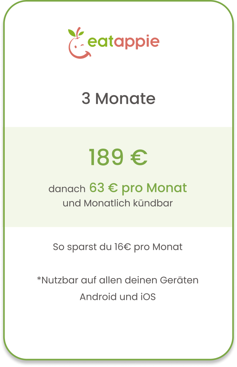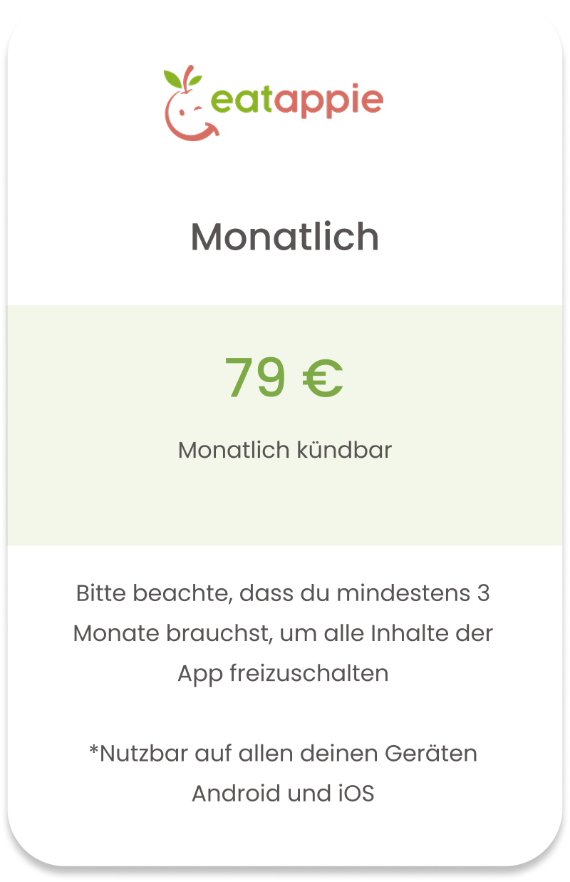 Damit du herausfinden kannst, ob eatappie das richtige für dich ist, kannst du die App kostenlos testen. Im Anschluss hast du die Möglichkeit, aus drei verschiedenen Bezahlmodellen zu wählen, um die Kosten optimal an deine Bedürfnisse anzupassen. Entscheidest du dich beispielsweise für unser 3-Monats-Abo, sind das weniger als 2 Euro pro Tag für deine mentale Gesundheit.