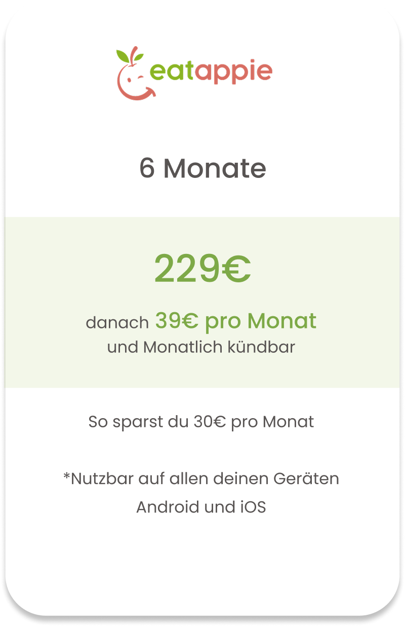 Damit du herausfinden kannst, ob eatappie das richtige für dich ist, kannst du die App kostenlos testen. Im Anschluss hast du die Möglichkeit, aus drei verschiedenen Bezahlmodellen zu wählen, um die Kosten optimal an deine Bedürfnisse anzupassen. Entscheidest du dich beispielsweise für unser 3-Monats-Abo, sind das weniger als 2 Euro pro Tag für deine mentale Gesundheit.